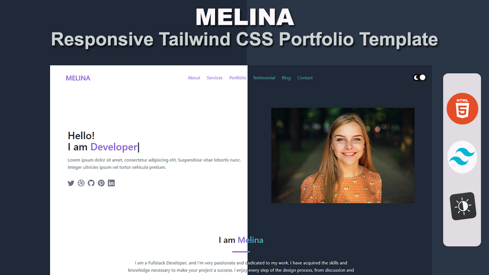 Melina is a responsive portfolio HTML template built with Tailwind CSS.